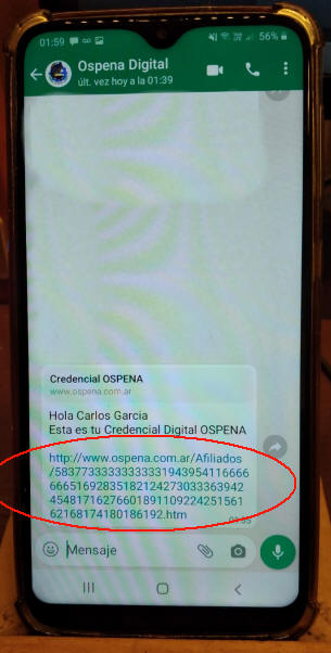 | Utilizando la aplicación Whatsapp, envianos un mensaje que contenga tu número de DNI (podés enviar mas de uno), y a la brevedad recibirás una dirección web donde alojamos tu credencial digital. | ||